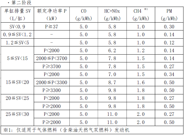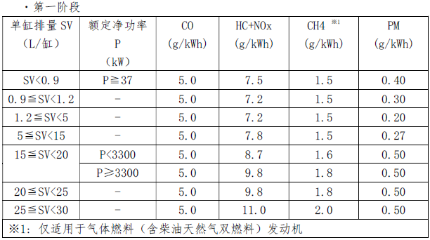 以下船舶装载的额定静功率大于(包括)37kW并且单缸排量未满30L的圧然式发动机及点燃式气体燃料(含柴油天然气双燃料)发动机(包括主机和辅机),针对于排气污染物成分CO、HC+NOx、CH4(仅适用于气体燃料(含柴油天然气双燃料)发动机)和PM,顺次适用第一和第二阶段排放规制。