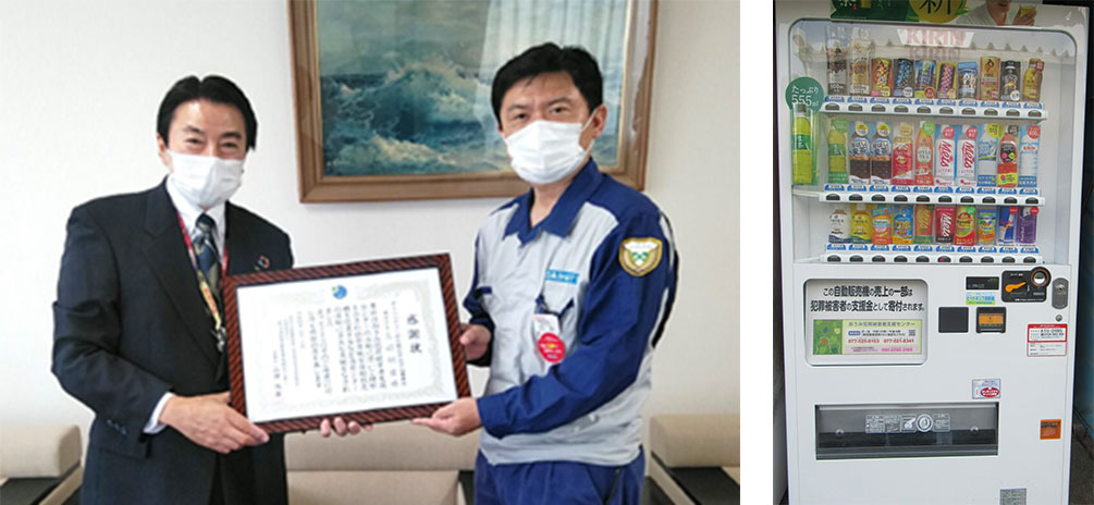 当社では、社内に設置している一部の自動販売機において寄付型自動販売機を設置しています。当自動販売機は、売上の一部が事件や事故の被害者支援の活動費に充てられています。このたび、本活動に多大な貢献をしたことが評価され、おうみ犯罪被害支援センターより感謝状が授与されました。