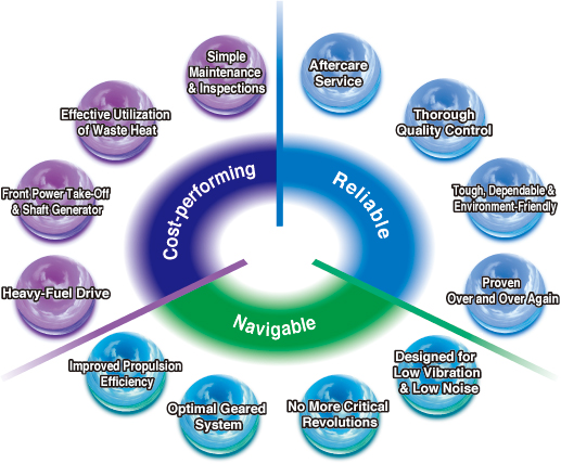 At DAIHATSU INFINEARTH we strive to constantly improve basic performance whilst constructively and logically pushing the bounds of new technological development. You can turn to us for most everything: power, economy, navigability, and so on. Our geared diesel engines are highly respected and praised for being forward-looking and always one step ahead.