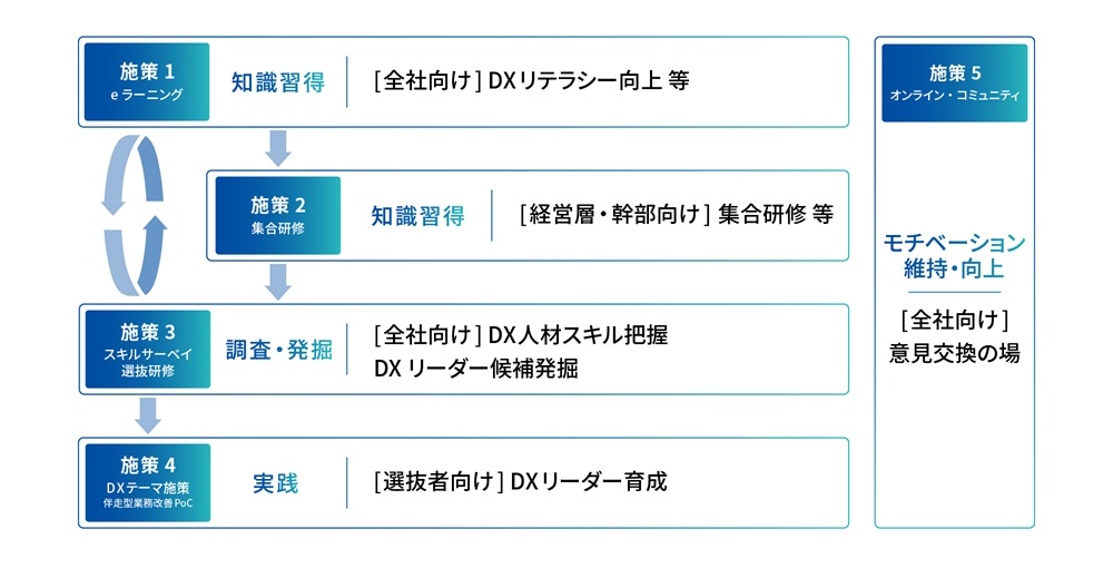 各種ツール利用の教育、社員のDXスキルを向上と合わせて、業務改革/改善が自発的に起きるように環境整備。