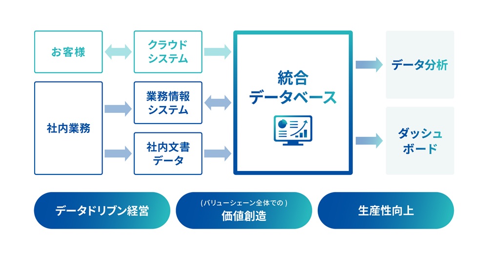 各種の業務システムや社内外の交換データを集約し、データ活用を促進する仕組みとして整備・構築。この基盤を活用し、データ分析やダッシュボード化することで、企業としてのDXを推進。