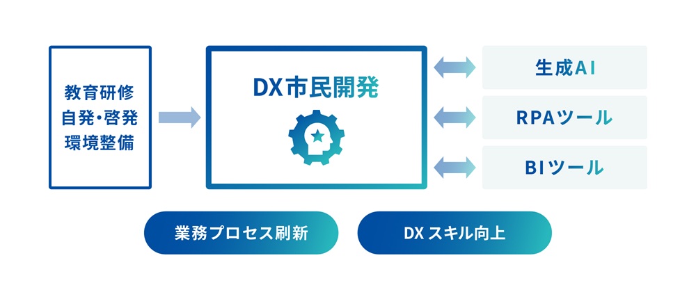 社員のDXスキルを向上して各自の業務改革/改善が自発的に起きるよう、DX市民を増やすための生成AI、BI、RPAの教育を進めるとともに環境整備を行う。業務改革で構築されたデータベースは順次統合デー夕基盤に組み込まれ、利活用される。