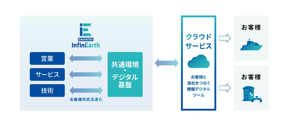 お客様と当社をつなぐクラウドサービス環境を整備・構築する。この上に、お客様対応を迅速化する営業ツールやお客様と当社間の情報デジタルツールを追加。