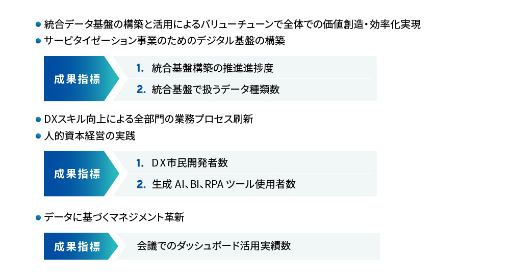①統合データ基盤、②AI・データ分析/DX市民開発環境、③クラウドサービスを構築、整備しDX戦略を推進してまいります。