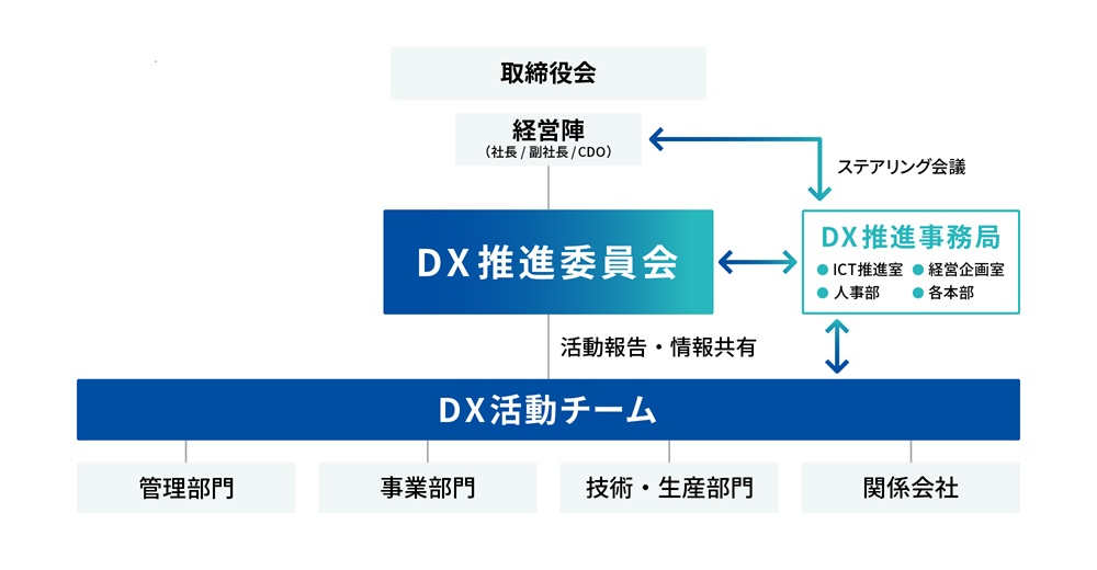 | ②ステアリング会議 | 経営層とDX事務局が毎月開催し、各施策やチームを方向づけ |