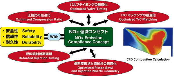当社の2次規制適合エンジンは、安全性、信頼性、耐久性を損なわないよう、圧縮比、バルブタイミング、高圧力過給機、燃料噴射時期、燃焼室及び燃料噴射弁の最適化を図ることによりNOx規制をクリアしました。燃費を含む一般性能はもちろんのこと、特に低質燃料油での低負荷燃焼及び瞬時の速度変動率を悪化させることなく、適切なチューニングを施しております。