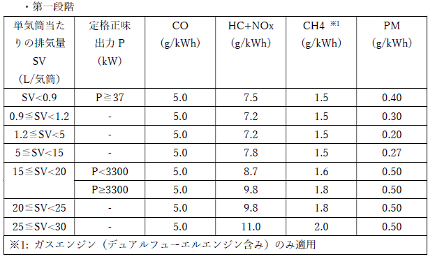 本規制の対象機関及び船舶は以下となります。 下記用途の船舶に、定格正味出力が37kW以上かつ単気筒当りの排気量が30L未満の船舶用圧縮着火エンジンおよび火花点火式ガスエンジン(デュアルフューエルエンジンを含む)(主機、補機共に)について、排気ガス成分であるCO、HC+NOx、CH4(ガスエンジン(デュアルフューエルエンジン含み)のみ適用)、PMに対し、第一段階及び第二段階が順次適用されます。