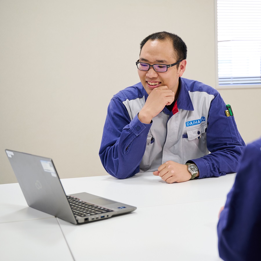 実際に自部署だけでなく他部署も気兼ねなく相談や協力のお願いができる、ウェルカムな空気感です。それは、「ダイハツインフィニアースとして良い製品を提供しよう」という意識が会社全体に浸透しているからだと感じます。こうした切れ目のない関係のおかげで、私自身もさまざまな知識を吸収して、視野が広げることができました。