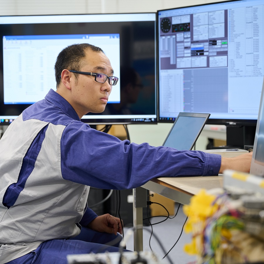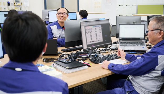 制御盤が弊社工場に納入されると、品質管理部と協力し、エンジンの試運転に於いて問題が無いか確認し、出荷された製品に関してはグローバルサービス部とやり取りし、お客様の元で安全に運転できるようデータ調整を行います。