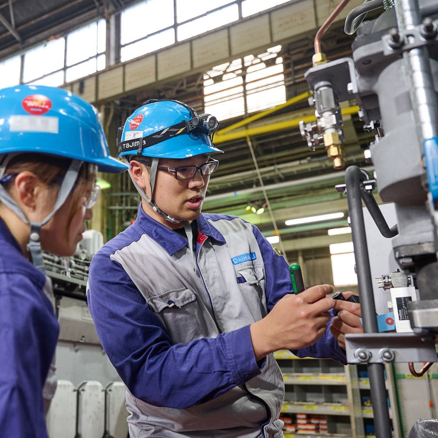 エンジン制御盤設計業務に従事しており、見た目通り元気で行動が早く、人当たりも良いため、他設計部門や工場部門からも頼りにされる人物です。海外出張や展示会で情報収集も行い、そこで得た情報を積極的に展開し、チーム力向上を図ってくれる前向きな人物でもあり、今後の活躍にも大いに期待しています。