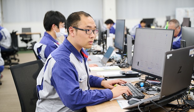 入社当初は、志望動機となった監視システムに関連する仕事に就きたいと思っていたのですが、さまざまな部署を体験する新人社員研修を通じてエンジンを動かすシステムに興味が出てきて、現在の部署を希望しました。