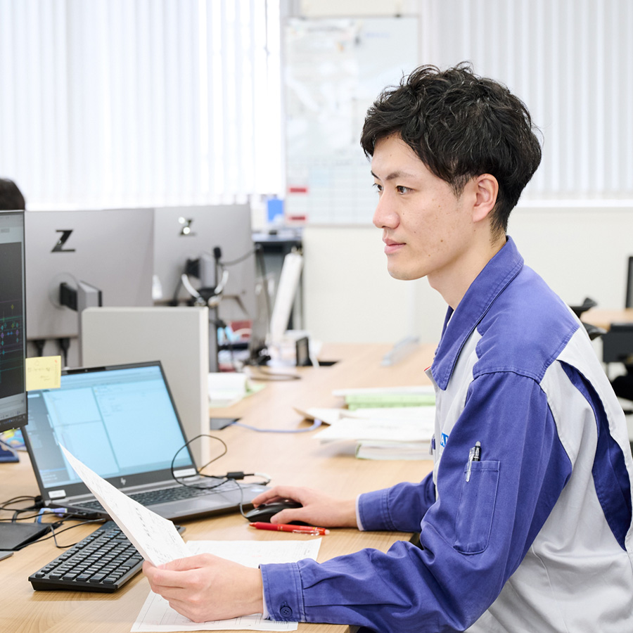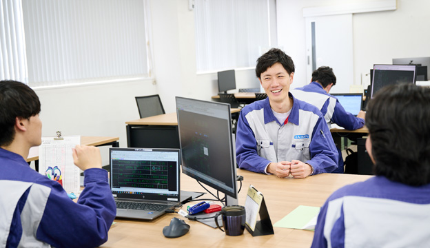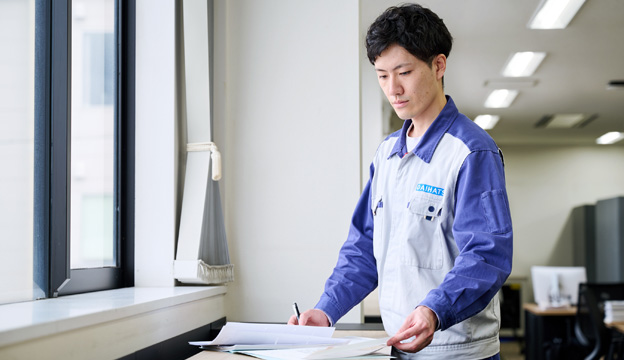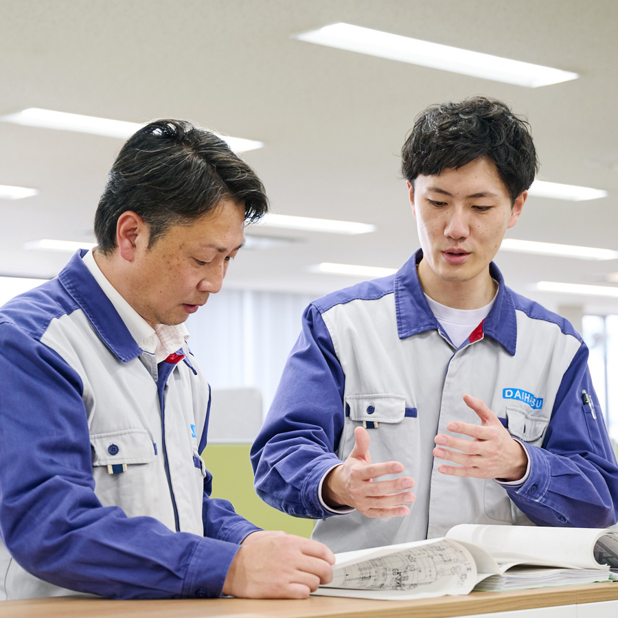 私は入社するまで船舶やエンジンに関する知識はありませんでしたが、配属前の研修やOJTで基礎を学ぶことができました。それでも若手の頃は、上司や先輩からもらった指示通りに業務を行うことで精一杯の状態。それから経験を積んで中堅社員といわれるようになった今では、後輩に指示を出す機会が増えてきました。さらに、自部署の業務システムについて考え、より高い精度で効率的に仕事ができる環境づくりにも携わっています。このように業務内容の幅が広がることで新たなスキルの習得や、やりがいの発見につながっています。私が所属する部署は課長をリーダーとして活発にコミュニケーションをとっており、キャリアを問わず意見を交わすことでスキルアップできる点も特長です。