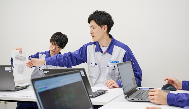 また、陸用エンジンは用途や設置する建物・場所によって求められる要素が異なり、特殊仕様が多い点が特色です。そのため設計者のアイデアを反映できる余地が大きく、専門職の視点からみても魅力ある仕事といえるでしょう。私自身も設計担当として、もっと上のレベルを目指して取り組んでいきたいと考えています。